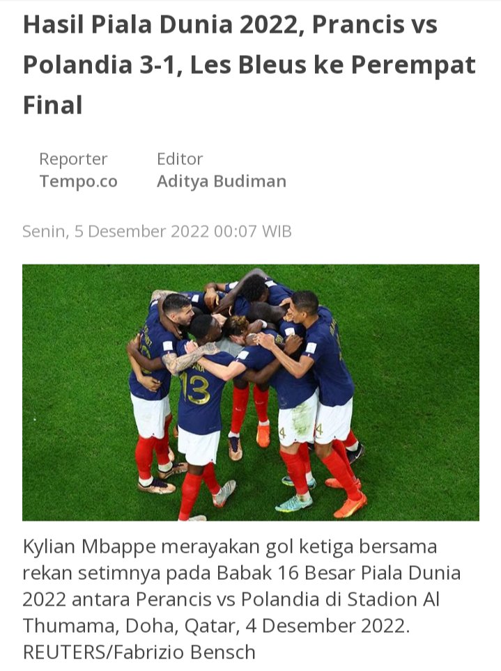 Perancis membekuk Polandia dengan skor 3-1 dalam pertandingan babak 16 besar Piala Dunia 2022 yang berlangsung di Stadion Al Thumama, Doha, Qatar, Minggu (4/12/2022).