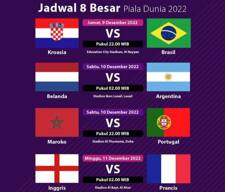 Jakarta – Perempatfinal Piala Dunia 2022 dimulai pada Jumat (9/12/2022) malam WIB. Simak jadwal seluruh pertandingannya di artikel ini!